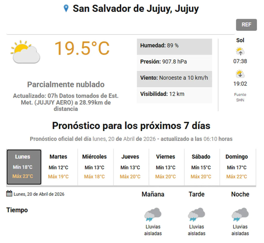 Para este lunes 20 de abril, se prevé una temperatura máxima de 23°C con probabilidad de lluvias aisladas en la capital jujeña, en el marco de un inicio de semana marcado por la inestabilidad climática.