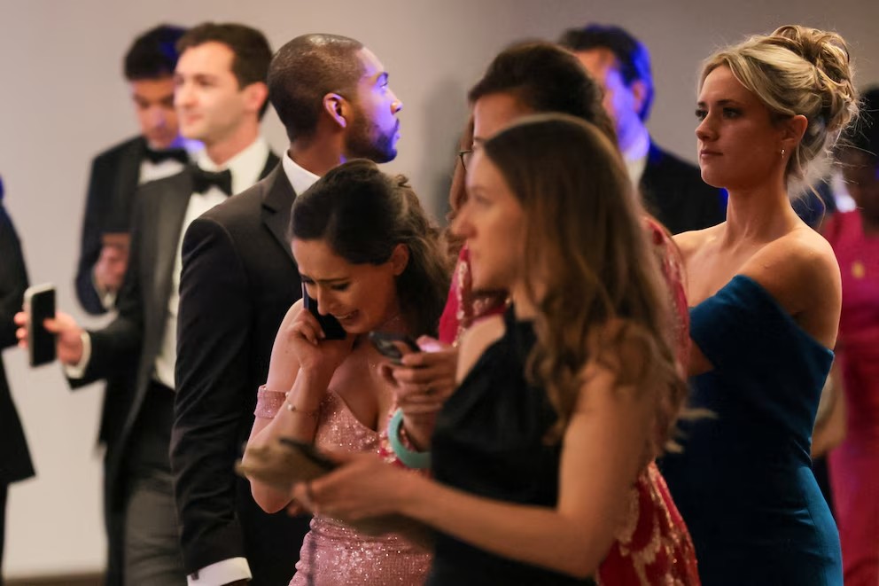 Los disparos se produjeron cuando la velada apenas comenzaba. Los asistentes comían una ensalada de arvejas y burrata, y los camareros se preparaban para servir el siguiente plato, cuando un equipo de seguridad irrumpió en el salón de baile y ordenó a todos tirarse al piso. Periodistas con trajes de gala y esmoquin se agacharon junto a las mesas mientras el vino salpicaba los manteles blancos. Alguien gritó “¡Apártese!”, otros pedían que se agacharan, y en un momento alguien en la sala exclamó “¡EE.UU.!”. Testigos reportaron haber escuchado entre cinco y ocho disparos.