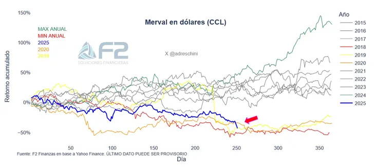 El S&P Merval en dólares, en estos momentos, se encuentra en el mismo rendimiento acumulado que sucedió en 2019 luego de la derrota de Mauricio Macri frente a Alberto Fernández. En ese momento, las acciones se desplomaron más de 50% en una sola jornada. La pérdida actual parece menos abrupta, pero se da en un contexto en el que la renta variable arrastra más de seis meses consecutivos de deterioro, lo que da cuenta de la creciente aversión al riesgo y la búsqueda de mayor cobertura.