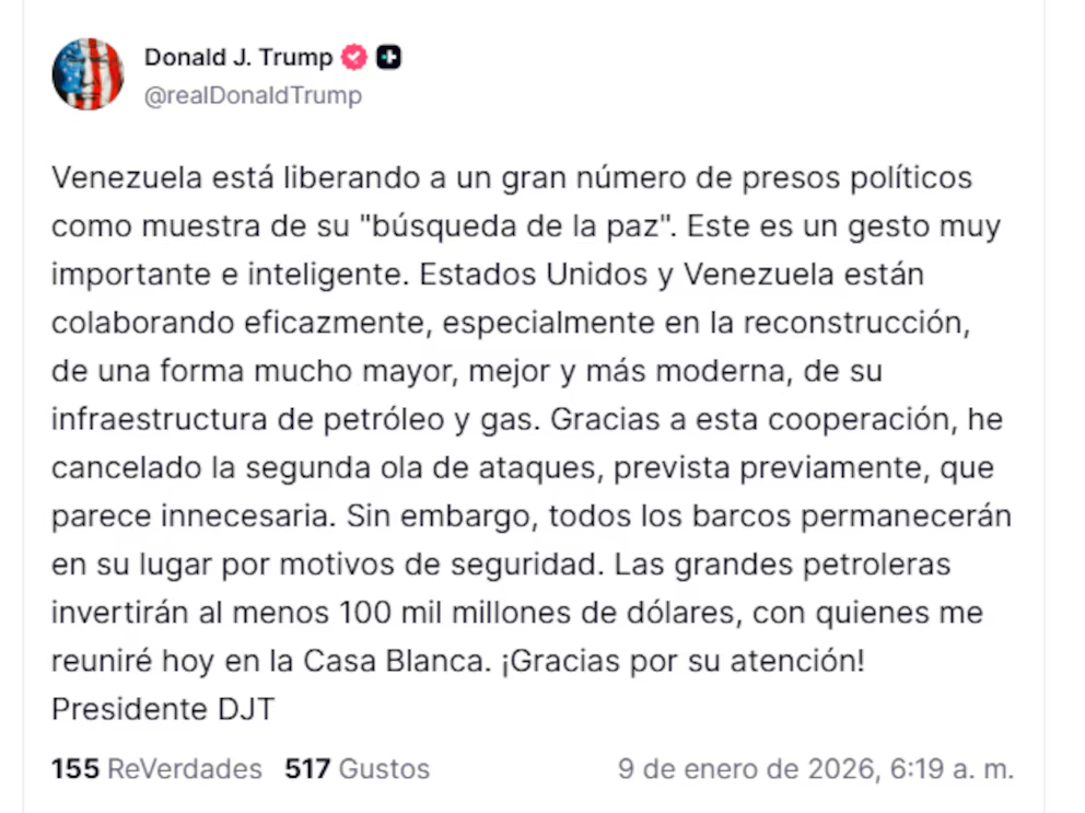 En el mismo mensaje, Trump informó que grandes empresas petroleras invertirán al menos 100 mil millones de dólares en Venezuela y adelantó que se reunirá con representantes de esas compañías en la Casa Blanca para avanzar en los acuerdos económicos.