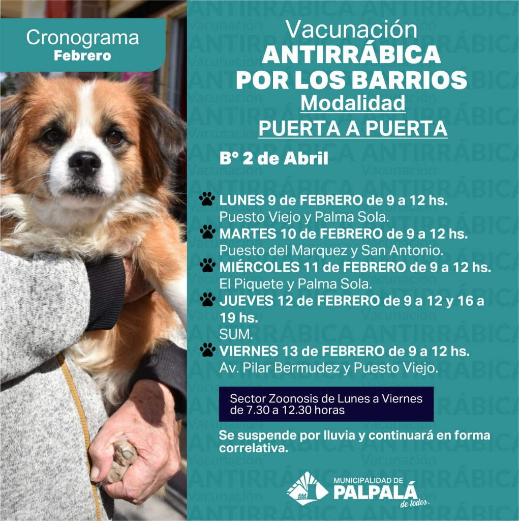 Además, se realizará un operativo de vacunación antirrábica puerta a puerta en la ciudad de Palpalá, específicamente en el barrio 2 de Abril, con el siguiente cronograma: