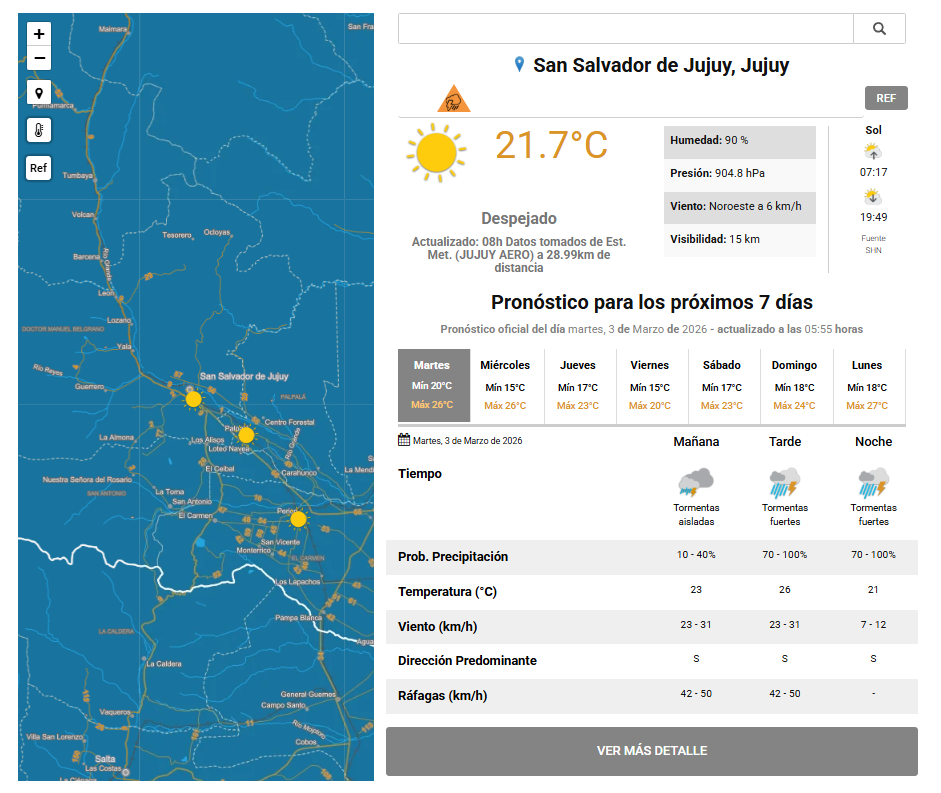 Particularmente la jornada de este martes se presenta inestable en gran parte de la provincia, con lluvias y tormentas, rige un alerta amarillo y naranja que abarca principalmente a los Valles y la región del Ramal, incluyendo los departamentos El Carmen, Ledesma, Palpalá, San Antonio, San Pedro, Santa Bárbara, Valle Grande y las zonas bajas de Dr. Manuel Belgrano y Tilcara.