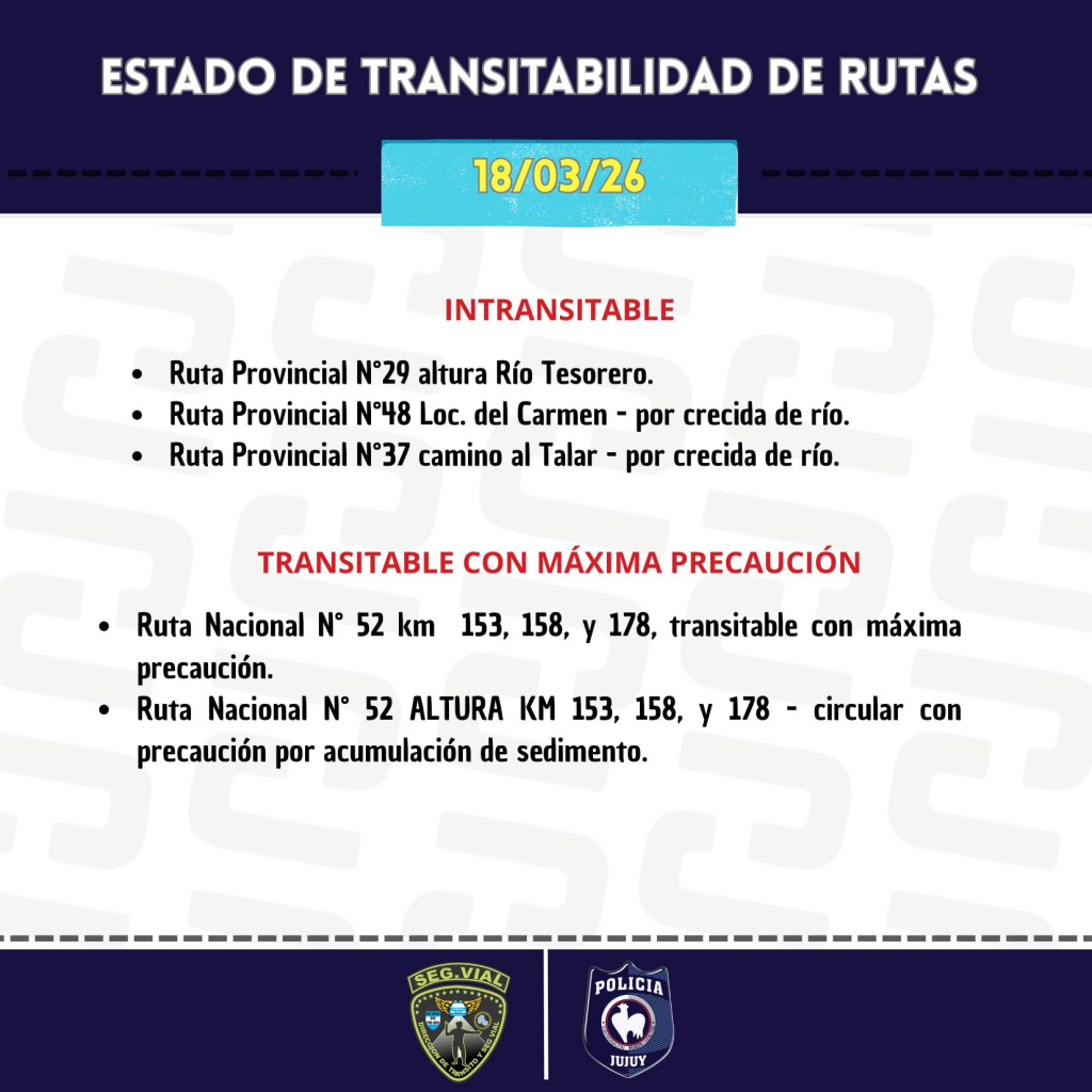 El estado de transitabilidad de las rutas en la provincia presenta serias complicaciones este miércoles 18 de marzo, debido principalmente a la crecida de ríos y acumulación de sedimentos en distintos tramos. Las autoridades solicitaron a la población extremar las precauciones y evitar circular por las zonas afectadas.
