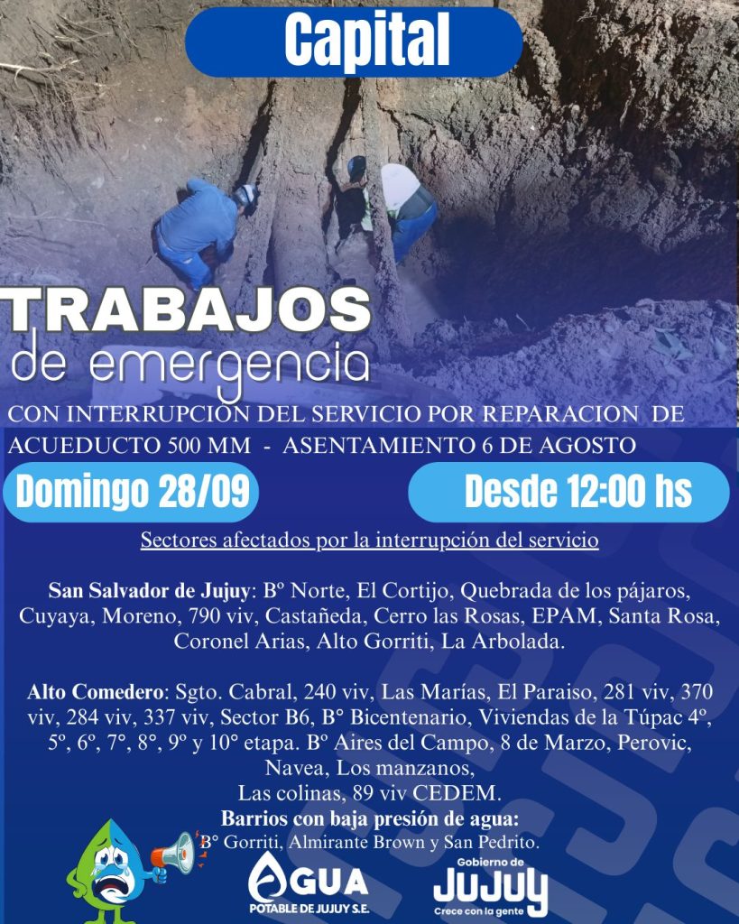Agua Potable de Jujuy informó que este domingo se producirá una interrupción programada del servicio de agua potable debido a una rotura de gran magnitud en el acueducto principal de 500 mm ubicado en el Barrio Asentamiento 6 de Agosto – Huaico, que abastece desde la Planta Alto Reyes.