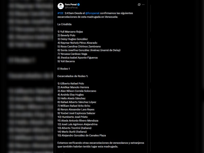Según el mensaje del Foro Penal en la plataforma X, la organización se encuentra “verificando otras excarcelaciones de venezolanos y extranjeros que también habrían tenido lugar esta madrugada”.