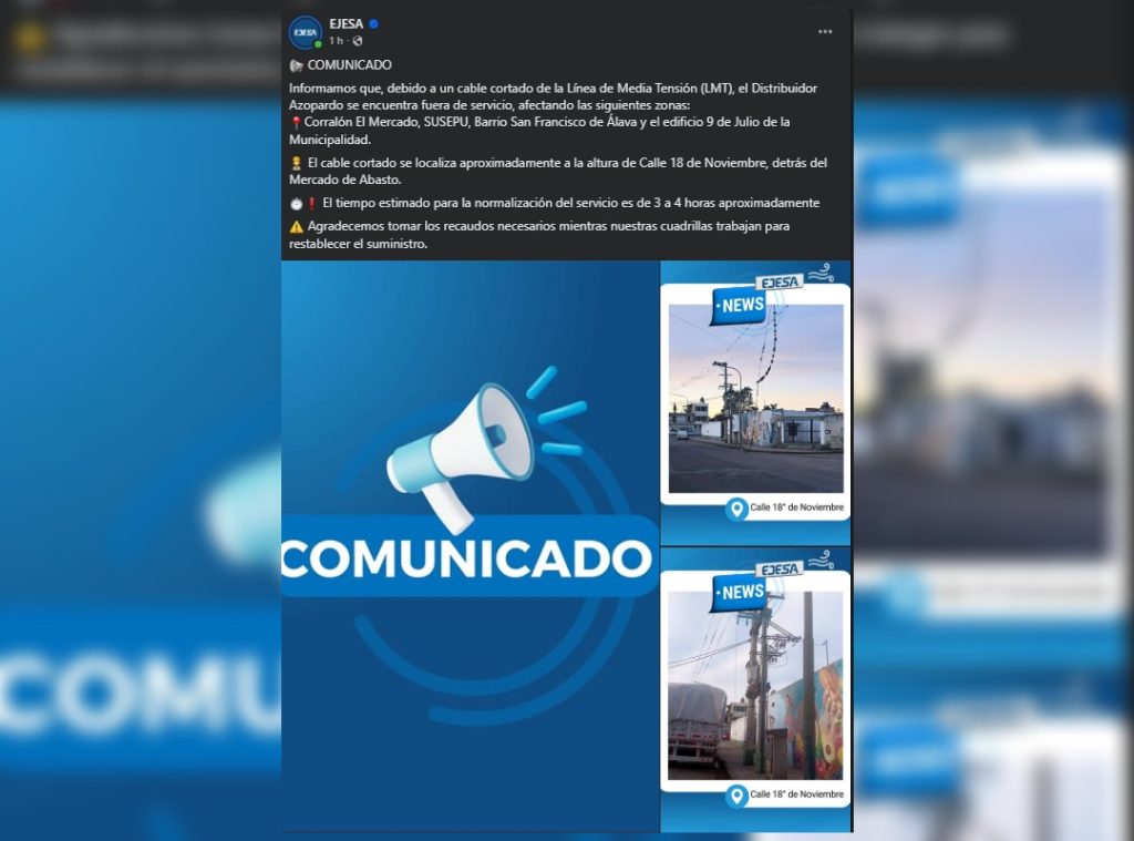Por ejemplo, cerca de las 8.00 horas, la empresa informó que debido a un cable cortado de la Línea de Media Tensión (LMT), el Distribuidor Azopardo se encuentra fuera de servicio, afectando las siguientes zonas: Corralón El Mercado, SUSEPU, Barrio San Francisco de Álava y el edificio 9 de Julio de la Municipalidad. El cable cortado se localiza aproximadamente a la altura de Calle 18 de Noviembre, detrás del Mercado de Abasto.