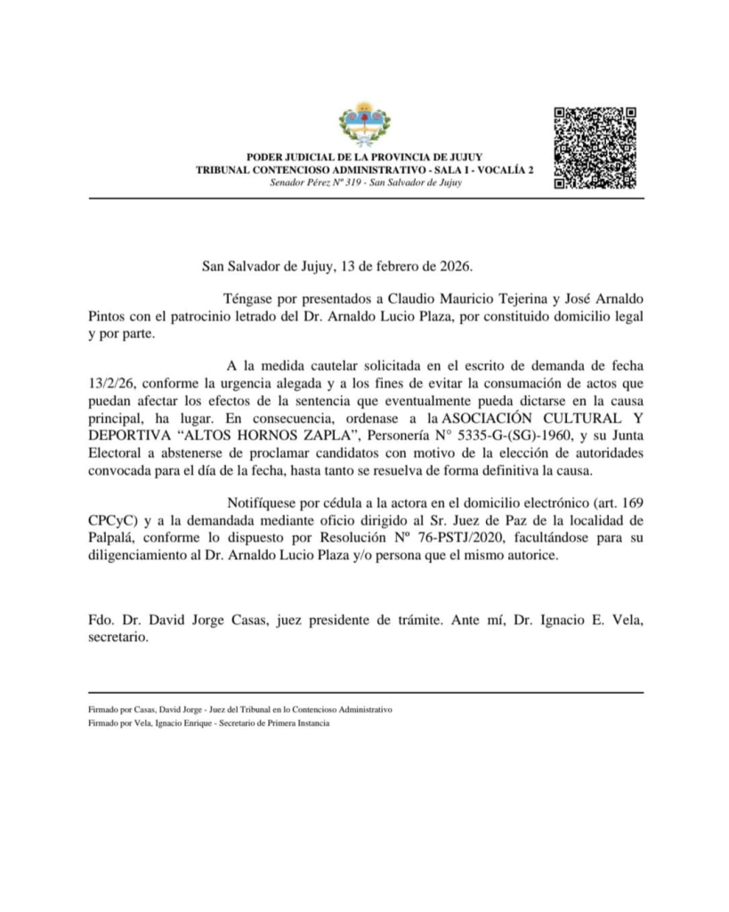 Sorpresa en la institución merengue, ese el sentimiento que atraviesa la vida institucional del club más popular de Palpalá, porque mientras las autoridades, junta electoral, socios y medios periodísticos que cubren la actualidad merengue se preparaban para una jornada electoral tranquila, a media mañana todos terminaron por enterarse que un grupo de socios con el patrocinio del abogado Lucio Plaza, habían presentado una medida cautelar que ordena «abstenerse de proclamar candidatos».